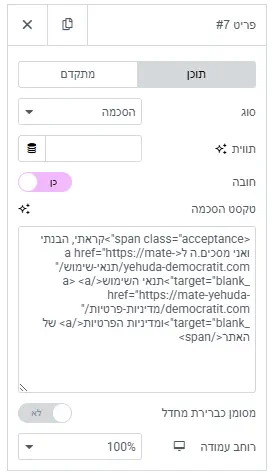 - אלמנטור – יש להוסיף פריט "הסכמה" (ראו תמונה) בשדה הטקסט להכניס את התוכן הבא: